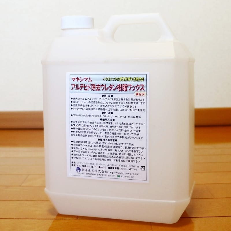 「シックハウス症候群」の原因物質の中でも消臭が困難な、室内のアルデヒド類を分解除去する、環境安全対策を徹底追求した、シックハウス対応ワックスです。それに、ウレタンを配合で耐久性・耐摩耗性・耐水性・耐熱性・高光沢が特長のフロアワックスです。