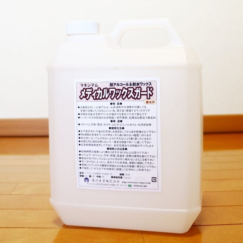消毒用エタノール等アルコール系液剤や水滴等が付着しても、塗膜が溶解したり白化しにくいワックスですので、大切な床がシミになるのを防ぎます。