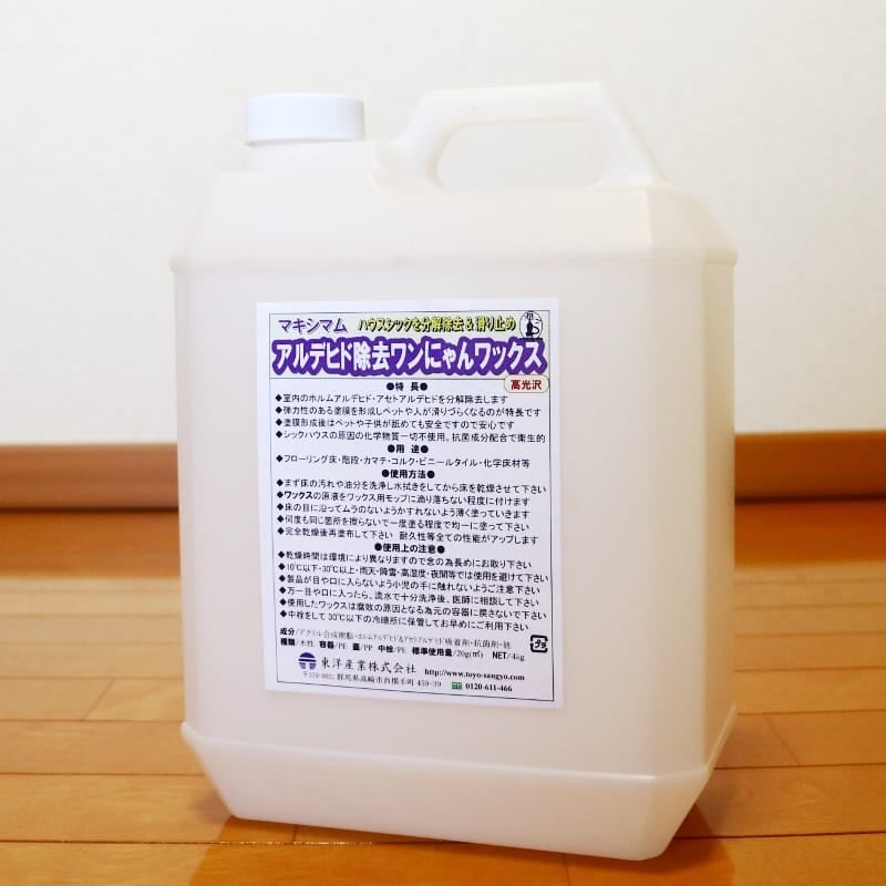 滑り止め用ペットワックス、「ワンにゃんワックス」にアルデヒド除去剤を配合。滑り止め効果がありながらも、室内のアルデヒド類を分解除去する、大変画期的なフローリングワックスです。ノンスリップ効果の弾力性の塗膜でペットが走っても滑りを軽減し、足腰への負担を軽減します。