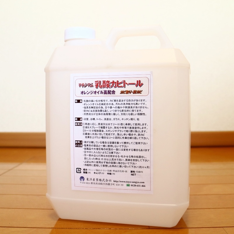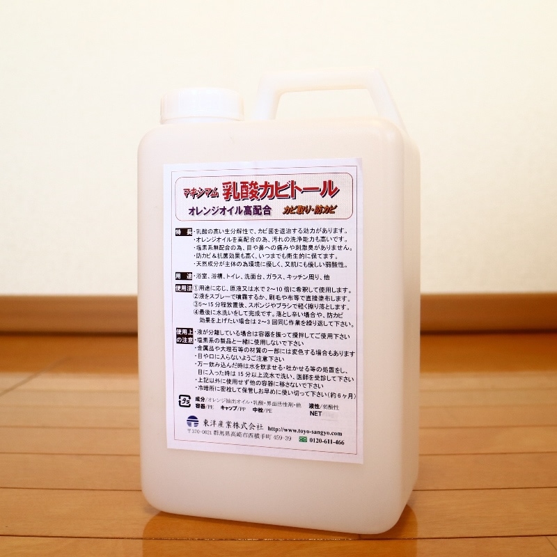 - 「乳酸カビトール」は、カビ取り剤ですが漂白剤ではありません。唯、オレンジオイルをかなり多く配合していますので、じわじわと時間は掛かりますがカビは確実に減り、汚れは落とせます。塩素系漂白剤のように素材を脱色させてしまう恐れもありません。「素材を子供やペットが触ったり舐めるからカビを死滅させて衛生的に保ちたい」というのが目的でしたら、安全ですのでお勧めです。